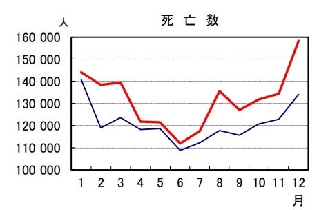 一部マスメディアでも話題になっているかもしれませんが、超過死亡者(前年の死亡者数ー当年の死亡者数)がここ数年増加しています。我々の生活は死と共存しています。下記グラフは令和5年2月28日に厚生労働省人口動態統計速報値の死亡数です。青色は令和3年、赤色は4年のデータです。各月の死亡者数はいずれの月も令和3年を令和4年が上回っています。ちなみに大きく跳ね上がっている12月のデータでは前年同月比18.2%増の24,361人も死亡者数が超過(前年を上回っています)令和4年はこのように高い水準にあるにもかかわらず、令和5年3月24日に発表された令和5年1月の死亡者数は、令和4年同月に17.3%増の24,978人上回り168,970人となっています。